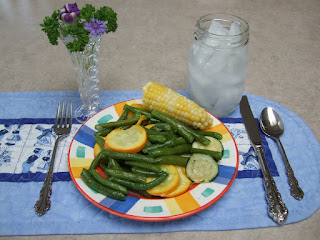 One night I didn't have any potatoes, so I pan fried Zucchini and a little onion and served it with fresh corn on the cob. Of course add a few flowers for color!!! Oh and don't forget to drink lots of WATER!!!